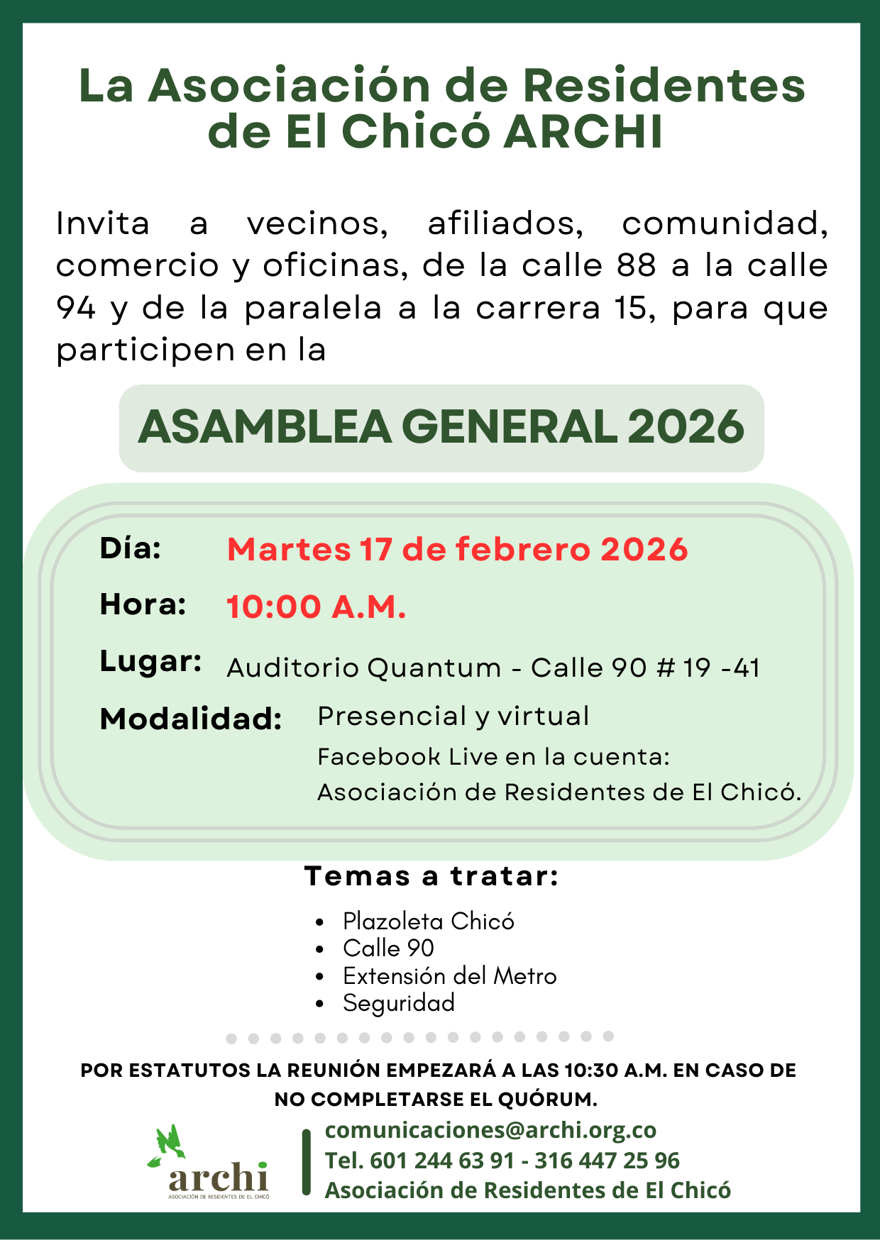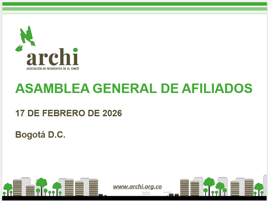 Todos los años la Asociación de Residentes de El Chicó solicita a la Asamblea autorizar a la Representante Legal para actualizar el proceso de permanencia en el Régimen Tributario Especial ante la DIAN como Entidad Sin Ánimo de Lucro. La Asamblea se llevó a cabo el 17 de febrero de 2026 y según el mandato de la misma, se procedió a preparar toda la información legal, financiera y de la gestión de ARCHI durante el 2025, la cual está disponible para consulta de nuestros afiliados y comunidad en general .